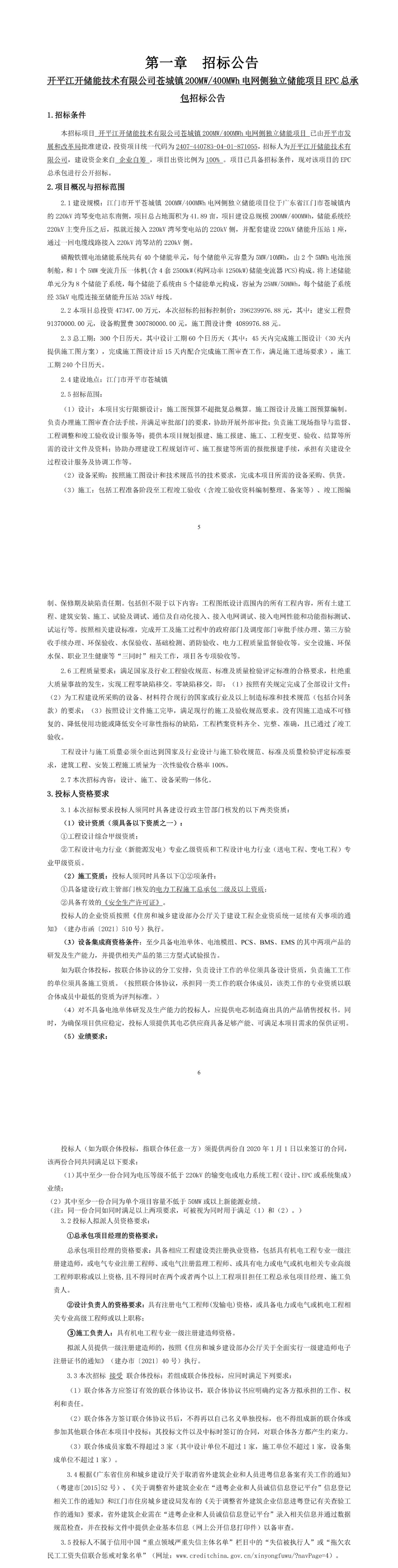 項(xiàng)目總投資47347.00萬元,約合1.183675元/Wh,總工期為300個(gè)日歷天,其中設(shè)計(jì)工期60個(gè)日歷天,施工工期240個(gè)日歷天。本次招標(biāo)范圍涵蓋設(shè)計(jì)、施工、設(shè)備采購全流程。投標(biāo)人(含聯(lián)合體任意一方)需提供2020年1月1日以來簽訂的兩份合同,分別滿足電壓等級(jí)不低于220kV的輸變電或電力系統(tǒng)工程業(yè)績(jī),以及單個(gè)項(xiàng)目容量不低于50MW的新能源業(yè)績(jī)要求。