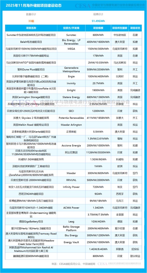 中國儲(chǔ)能網(wǎng)訊:2025年11月,CESA儲(chǔ)能應(yīng)用分會(huì)產(chǎn)業(yè)數(shù)據(jù)庫追蹤到33起海外儲(chǔ)能項(xiàng)目建設(shè)動(dòng)態(tài)事件,總規(guī)模為51.49GWh,涉及Sunotec、Eku Energy、LP Renewables、MEGA、Generadora Metropolitana、Engie、Enlight、Statera Energy、SECI、Potentia Renewables、Acciona Energía、Masdar、RRVUNL、Infinity Power、ACWA Power、 Leag、Baltic Storage Platform、Eku Energy、Energy Vault等全球能源投資方/開發(fā)商,建設(shè)地點(diǎn)位于智利、英國、印度、西班牙、烏茲別克斯坦、美國、加拿大、德國、澳大利亞、愛沙尼亞、埃及、阿聯(lián)酋等全球20多個(gè)國家。