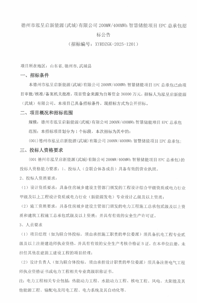 中國儲(chǔ)能網(wǎng)訊:12月1日,德州市泓呈啟新能源(武城)有限公司200MW/400MWh智慧儲(chǔ)能項(xiàng)目EPC總承包招標(biāo)公告發(fā)布。項(xiàng)目招標(biāo)人為泓呈啟新能源(武城)有限公司,項(xiàng)目位于山東省德州市武城縣武城鎮(zhèn)付王莊南,項(xiàng)目總?cè)萘?00MW/400MWh,其中磷酸鐵鋰儲(chǔ)能系統(tǒng)195MW/390MWh,全釩液流儲(chǔ)能5MW/10MWh。本次招標(biāo)為EPC總承包。