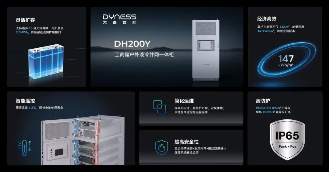 本項目所采用的大秦數(shù)能DH200Y液冷一體機,其單柜容量高達232kWh,支持最多 10 機交流并聯(lián),可擴展至 2.3MWh,能夠適配不同規(guī)模的用電需求。該產(chǎn)品具有設(shè)計緊湊、占地面積小的特點,能量密度達147kWh/㎡,能夠為客戶有效節(jié)約用地空間。在安全層面,DH200Y 搭載了 Pack 級電芯監(jiān)測、三級消防探測以及主動排氣和被動防爆設(shè)計,通過全方位防護設(shè)計確保設(shè)備長期安全穩(wěn)定運行。該產(chǎn)品廣泛適用于辦公園區(qū)、商業(yè)樓、充電站等多種并網(wǎng)場景,是企業(yè)構(gòu)建高效、可靠智慧能源體系的理想選擇。