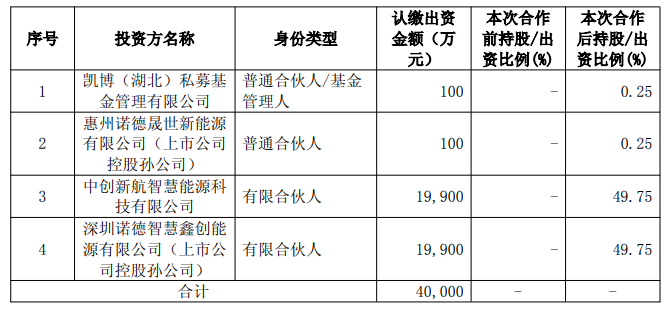 根據(jù)協(xié)議,惠州諾德晟世新能源有限公司(以下簡(jiǎn)稱“惠州諾德晟世”)、深圳諾德智慧鑫創(chuàng)能源有限公司(以下簡(jiǎn)稱“諾德智慧鑫創(chuàng)能源”)擬與中創(chuàng)新航智慧能源科技有限公司(以下簡(jiǎn)稱 “中創(chuàng)新航智慧能源”)、凱博(湖北)私募基金管理有限公司(以下簡(jiǎn)稱“凱博資本”)共同投資設(shè)立產(chǎn)業(yè)基金,由凱博資本擔(dān)任基金管理人。