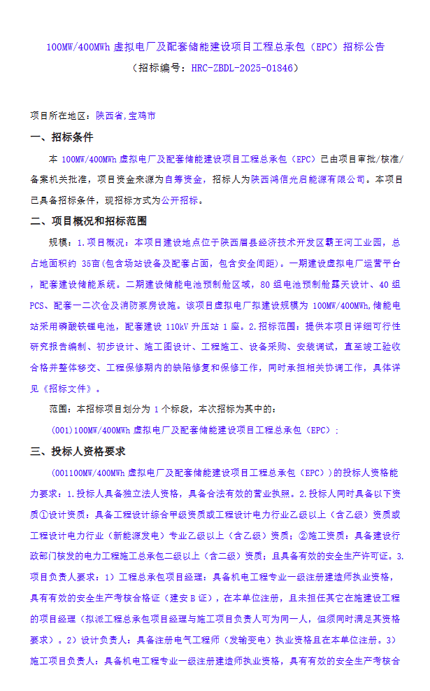 中國儲能網(wǎng)訊:12月3日,陜西鴻信光啟能源有限公司發(fā)布100MW/400MWh虛擬電廠及配套儲能建設項目工程總承包(EPC)招標公告。