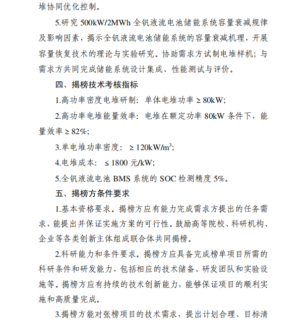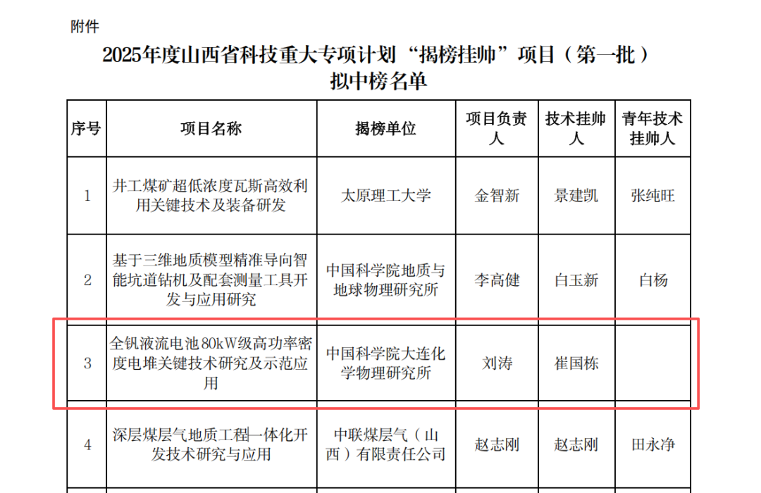 此前,7月16日,山西省科學(xué)技術(shù)廳曾發(fā)布《關(guān)于2025年度山西省科技重大專項(xiàng)計(jì)劃“揭榜掛帥”項(xiàng)目(第一批)張榜的通知》,此次張榜項(xiàng)目共14項(xiàng)。其中包含1個(gè)液流項(xiàng)目,全釩液流電池80kW級(jí)高功率密度電堆關(guān)鍵技術(shù)研究及示范應(yīng)用,需求單位為山西賽盈儲(chǔ)能科技有限公司。