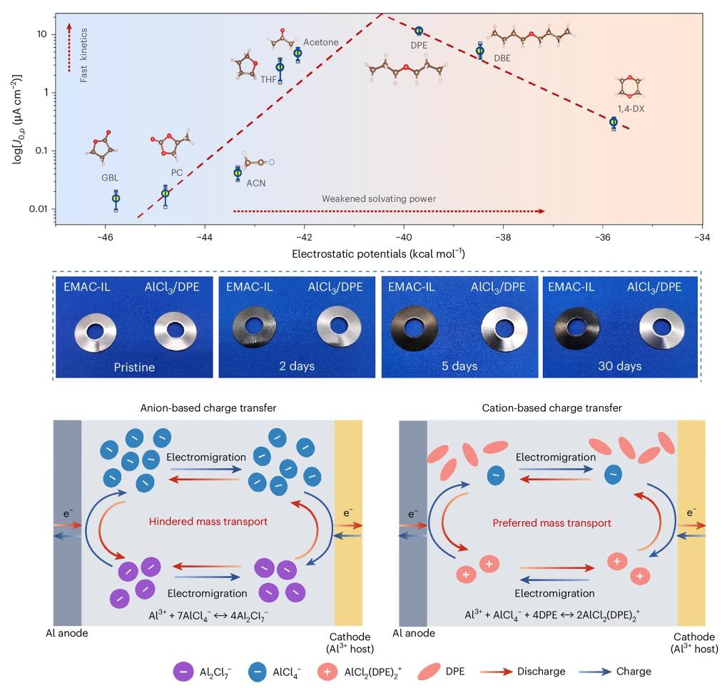 項(xiàng)目團(tuán)隊(duì)開創(chuàng)性提出“有機(jī)雙氯”溶劑化電解液設(shè)計(jì)策略,以氯化鋁/正丙醚有機(jī)體系替代傳統(tǒng)離子液體,通過精確調(diào)控溶劑化結(jié)構(gòu),將腐蝕性氯離子“限域”在鋁離子周圍,顯著降低腐蝕性的同時(shí)提升電化學(xué)可逆性。