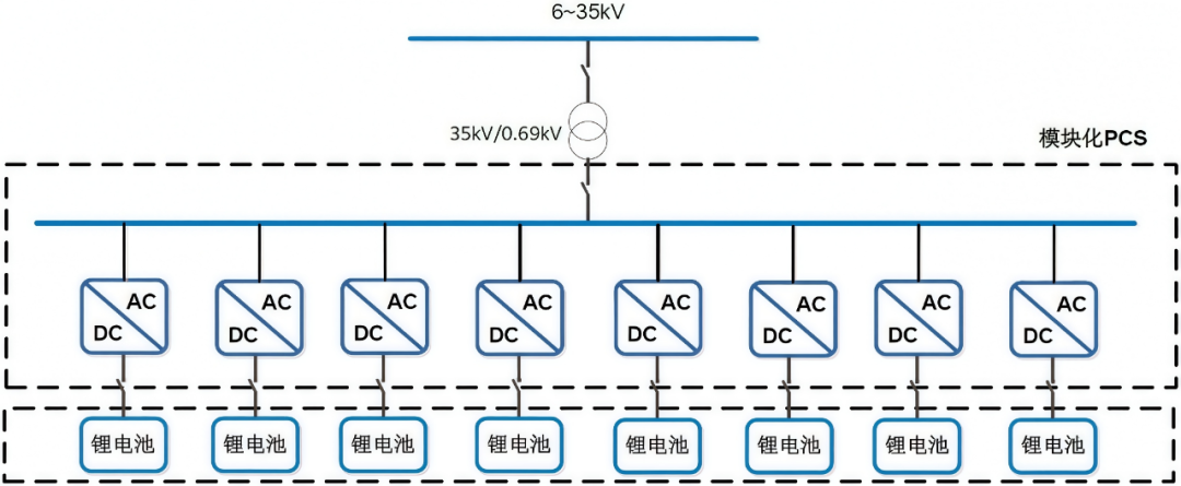傳統(tǒng)集中式儲能系統(tǒng)一般將多個電池簇并聯(lián)匯流,通過兆瓦級儲能變流器(PCS)進(jìn)行集中式能量處理。這種儲能架構(gòu)的拓?fù)浣Y(jié)構(gòu)簡單,PCS單機(jī)功率相對較大,初期設(shè)備成本較低。但將大量電池簇直接并聯(lián)的粗放式能量管理會引發(fā)“木桶效應(yīng)”、簇間環(huán)流等固有缺陷,導(dǎo)致系統(tǒng)可用容量降低,故障易擴(kuò)散,制約大規(guī)模應(yīng)用安全性與經(jīng)濟(jì)性。