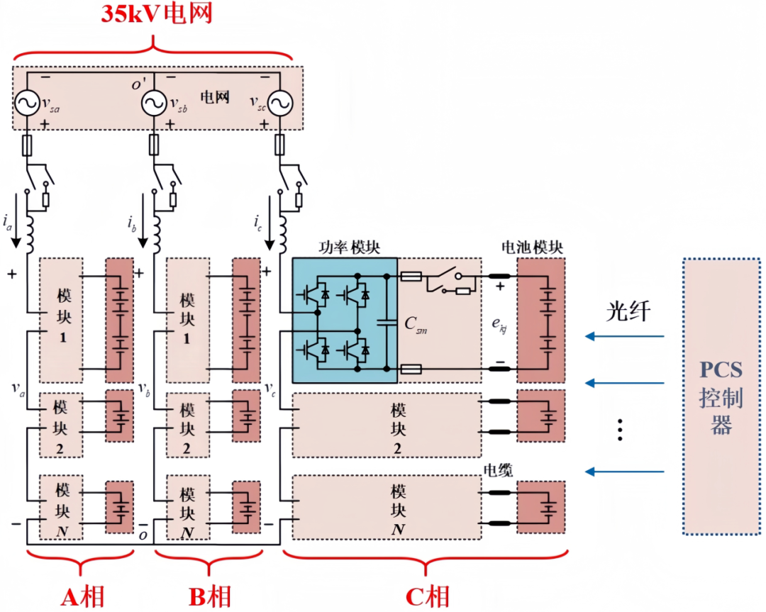 為突破上述瓶頸,清能院于2021年成功牽頭研制全球單機(jī)容量最大的35千伏/25兆瓦高壓直掛儲能系統(tǒng)。該系統(tǒng)采用級聯(lián)H橋變換器拓?fù)?,?shí)現(xiàn)電池簇經(jīng)功率單元逆變后串聯(lián)形成高壓,直接掛接35千伏電網(wǎng),省去工頻變壓器環(huán)節(jié)。此舉在顯著提升單機(jī)容量、系統(tǒng)效率及響應(yīng)速度的同時,延續(xù)了分散式架構(gòu)對電池簇的精細(xì)化管理優(yōu)勢。