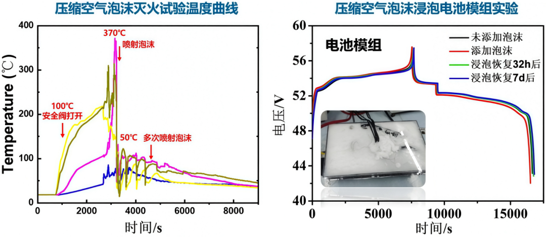 針對以上痛點(diǎn),清能院自主研發(fā)了壓縮空氣泡沫滅火系統(tǒng)。該系統(tǒng)通過生成低含水量的氣液兩相滅火介質(zhì),有效融合氣體與液體滅火優(yōu)勢,可實(shí)現(xiàn)秒級滅火、快速降溫,并能保證12小時以上持續(xù)抗復(fù)燃。該系統(tǒng)所產(chǎn)泡沫電導(dǎo)率極低,對電池電學(xué)性能無影響,從根本上避免了因絕緣問題引發(fā)的二次電氣事故。