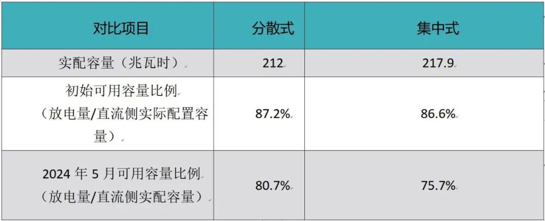 某省2021年同期建成的兩座百兆瓦級儲能電站規(guī)模均為100兆瓦/200兆瓦時,均采用同品牌280安時電池,但分別采用了分散式與集中式技術。經(jīng)過近兩年半的運行后,分散式電站的可用容量比例仍高出集中式5個百分點,凸顯了分散式技術高可用容量的優(yōu)勢。對比情況如表1所示。