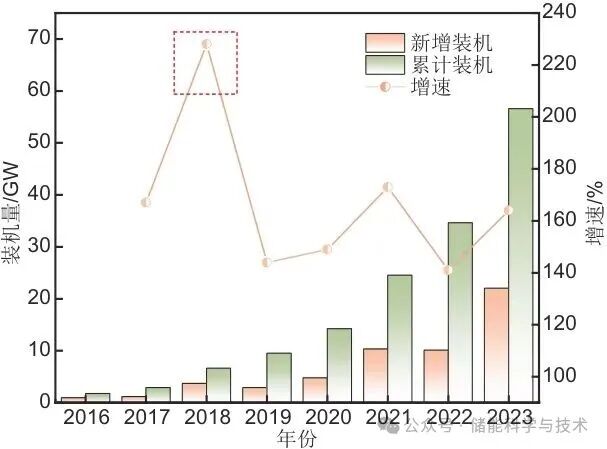 2016—2025年全球發(fā)生的電化學儲能電站火災按年份統(tǒng)計情況如圖1所示。整體來看,事故呈現(xiàn)階段性波動特征:2016—2018年事故數(shù)量持續(xù)上升,并在2018年達到峰值17起,究其原因為行業(yè)快速擴張情況下,存在的技術短板,例如三元鋰電池的熱失控風險高,以及安全標準的缺失。2018—2020年事故數(shù)量下降,主要由于政策干預措施的推動,例如中國頒布的GB/T 36276《電力系統(tǒng)電化學儲能系統(tǒng)通用技術條件》,以及技術路線的替代優(yōu)化,如磷酸鐵鋰電池市場占比升高;2020—2023年事故數(shù)量再次反彈至24起,反映市場裝機規(guī)模的激增。如圖2所示,根據(jù)中關村儲能產(chǎn)業(yè)技術聯(lián)盟、中商產(chǎn)業(yè)研究院的統(tǒng)計,全球電化學儲能累計裝機容量大約從14.2 GW增長至56.6 GW;2023年后事故風險逐步可控,這一轉(zhuǎn)變源于政策監(jiān)管的深化,安全技術的系統(tǒng)性升級,例如中國明確要求中大型儲能電站配置強制滅火系統(tǒng)。研究表明,火災事故的階段性波動與儲能裝機規(guī)模增長、技術路線迭代及政策動態(tài)調(diào)控密切相關,未來需通過強化國際標準協(xié)同機制、完善電池全生命周期管理體系,以實現(xiàn)安全性與規(guī)模化發(fā)展的平衡。
