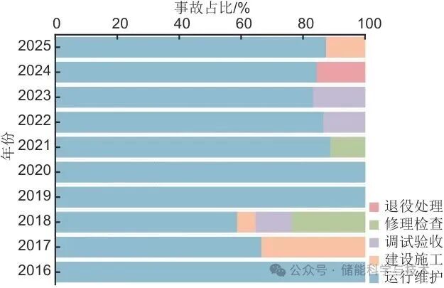 (1)2016—2025年發(fā)生的102起電化學儲能火災事故統(tǒng)計中,事故高發(fā)年份集中于2018年和2023年,第三季度為事故高發(fā)期,韓國發(fā)生事故數(shù)量最多,運行維護階段發(fā)生事故概率達80.8%,呈現(xiàn)出時間頻次集中、區(qū)域聚集明顯、運行維護階段高發(fā)的特點。