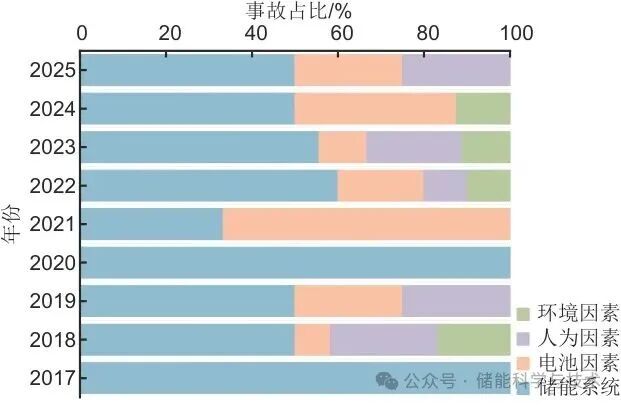 2016—2025年全球發(fā)生的電化學儲能電站火災按發(fā)生事故中的電池類型統(tǒng)計情況如圖5所示。從圖中不難看出,三元鋰電池更容易造成儲能電站事故,已知鋰離子電池種類的86起電化學儲能電站火災事故中,由三元鋰電池引起的事故達69起,占比約80.2%,磷酸鐵鋰電池占比19.8%。為滿足高速增長的能源需求,電化學儲能電站普遍選擇高能量密度的電池作為儲能單元,在此過程中往往忽視了其潛在的安全風險。相關研究表明,相比磷酸鐵鋰電池,三元鋰電池更容易發(fā)生熱失控,熱失控觸發(fā)溫度更低,且熱失控觸發(fā)時間更早。另外,三元鋰電池不需要外部的氧氣就可以發(fā)生燃燒,且誘發(fā)三元鋰電池單體熱失控需要的熱量更少,同時,三元鋰電池熱失控時會釋放更多的易燃易爆性氣體,增大了三元鋰電池發(fā)生火災爆炸的風險。由于三元鋰電池的以上特性,其在安全性方面需要更加嚴格的監(jiān)管。因此,中國國家能源局綜合司發(fā)布的《防止電力生產(chǎn)事故的二十五項重點要求(2022年版)(征求意見稿)》中提到中大型電化學儲能電站不得選用三元鋰電池、鈉硫電池,不宜選用梯次利用動力電池。數(shù)據(jù)顯示,三元鋰電池事故發(fā)生率持續(xù)高于磷酸鐵鋰電池,表明三元鋰電池在儲能領域仍占據(jù)一定市場份額。2020年后,隨著磷酸鐵鋰電池裝機占比快速提升,其熱穩(wěn)定性優(yōu)勢雖有效降低單體熱失控概率,但大規(guī)模應用后暴露出新的問題,如熱失控釋放的可燃氣體爆炸濃度范圍寬泛,易在密閉艙體內(nèi)形成燃爆風險。結(jié)果表明,行業(yè)需在加速三元鋰電池替代進程的同時,針對磷酸鐵鋰電池應用場景完善安全標準體系并強化周期性質(zhì)量管控機制。