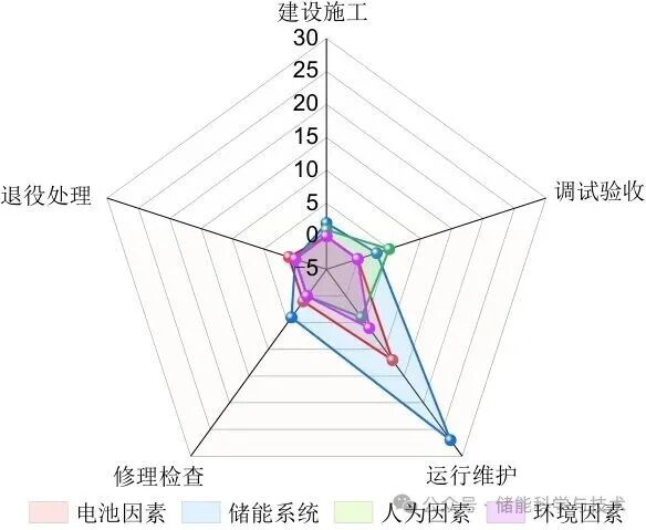 圖8是2016—2025年全球發(fā)生的電化學儲能電站火災按事故發(fā)生時不同電站狀態(tài)對應事故原因的雷達圖。從圖中不難看出,在運行維護階段,儲能系統(tǒng)、電池因素和環(huán)境因素發(fā)生故障、失誤等最易導致火災事故。主要原因是在運行維護階段,電池容易過充過熱、電池管理系統(tǒng)容易誤判、環(huán)境溫度過高等因素容易造成電站事故的發(fā)生。