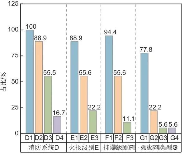 注:D1—火災報警系統(tǒng);D2—滅火抑爆系統(tǒng);D3—場站級消防安全監(jiān)管平臺系統(tǒng);D4—視頻AI預警系統(tǒng);E1—儲能艙級;E2—簇級;E3—PACK級;F1—儲能艙級;F2—簇級;F3—PACK級;G1—七氟丙烷;G2—全氟己酮;G3—水成膜;G4—其他