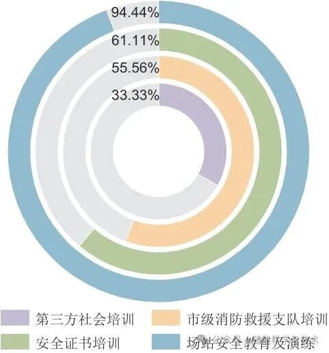 (1)運維團隊安全素質(zhì)能力提升方式。為全面提升儲能電站運維團隊的安全素質(zhì)能力,當前主要途徑包括場站安全教育與演練、第三方社會培訓、市級消防救援支隊培訓以及安全證書培訓。調(diào)查結(jié)果如圖11所示,94.44%的儲能電站優(yōu)先選擇場站內(nèi)部開展安全教育與實戰(zhàn)演練,體現(xiàn)出運維團隊對現(xiàn)場操作技能和應急響應能力培養(yǎng)的高度重視。其次為安全證書培訓(61.11%)和市級消防救援支隊培訓(55.56%),而第三方社會培訓的參與比例相對較低,僅為33.33%。整體上,電站管理者更傾向于通過內(nèi)訓手段進行常態(tài)化、針對性的安全能力提升。體現(xiàn)出行業(yè)培訓體系的系統(tǒng)性短板,第三方社會培訓多基于通用消防標準,缺乏電池熱失控特有情形的處置規(guī)范。安全證書培訓考核未覆蓋關鍵決策場景。場站培訓是成本-風險博弈的結(jié)果。