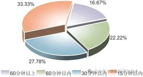 (2)與消防力量的響應聯(lián)動時效。調(diào)研結(jié)果如圖12所示,33.33%的儲能電站與屬地消防救援大隊的車程在15分鐘以內(nèi),27.78%在30分鐘以內(nèi),22.22%在60分鐘以內(nèi),另有16.67%的電站車程超過60分鐘。后者遠超電池熱失控黃金響應窗口,在火災等突發(fā)事件中面臨響應滯后風險,亟需通過加強自有應急能力或建設遠程預警機制來彌補空間劣勢。