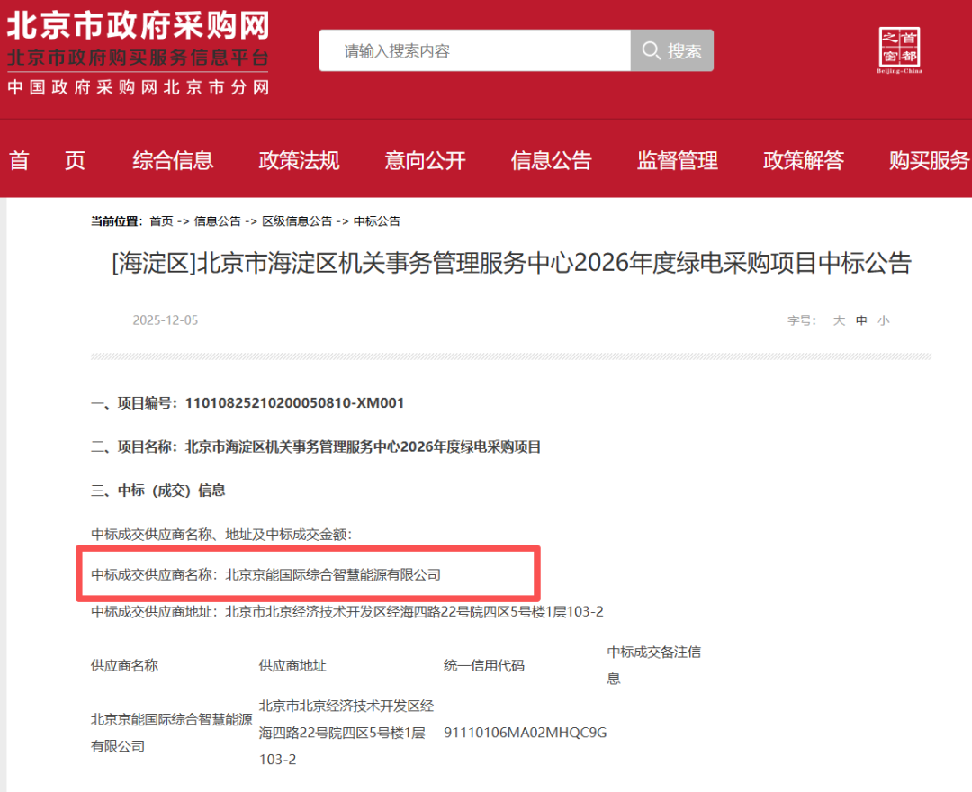 中國儲能網(wǎng)訊:近日,京能國際成功中標(biāo)北京市海淀區(qū)機(jī)關(guān)事務(wù)管理服務(wù)中心2026年度綠電采購項目,中標(biāo)電量達(dá)3000萬千瓦時。該項目是海淀區(qū)公共機(jī)構(gòu)首次集中帶量綠電采購,也是北京市近年來參與主體最廣、綠電占比要求最高的年度電量采購標(biāo)桿項目,具有重要的示范意義。