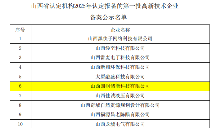 中國儲能網(wǎng)訊:12月8日,全國高新技術(shù)企業(yè)認(rèn)定管理工作領(lǐng)導(dǎo)小組辦公室發(fā)布了山西省2025年認(rèn)定報備高新技術(shù)企業(yè)備案公示,山西國潤儲能科技有限公司順利通過“國家高新技術(shù)企業(yè)”認(rèn)定,此次通過標(biāo)志著公司連續(xù)兩次獲得高企認(rèn)定,充分體現(xiàn)了國潤儲能在研發(fā)體系構(gòu)建、知識產(chǎn)權(quán)布局與成果轉(zhuǎn)化能力等方面持續(xù)獲得國家層面的認(rèn)可與支持。