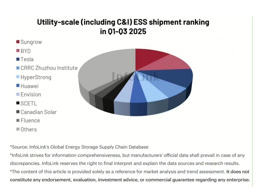 全球公用事業(yè)規(guī)模電池儲能市場繼續(xù)拉動需求。2025年前三季度出貨量達到252.5GWh,而前五名制造商(CR5)的第三季度市場份額環(huán)比下滑至47.3%,表明主要供應商之間的競爭加劇。排名前五的制造商分別是陽光電源、比亞迪、特斯拉、中車株洲研究所和海博思創(chuàng),其中比亞迪在第三季度超過了特斯拉,位居第二。展望全年,InfoLink公司認為,陽光電源、比亞迪和特斯拉是2025年公用事業(yè)規(guī)模儲能領域冠軍的主要競爭者。