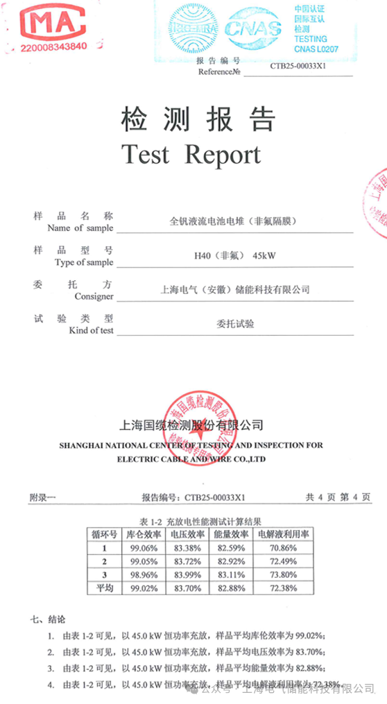 高性能非氟膜電堆是由上海電氣儲能科技有限公司聯(lián)合蘇州實驗室、華東理工大學發(fā)布的儲能新品,并通過上海國纜檢測有限公司第三方產(chǎn)品測試,45kW額定功率下EE、CE和VE分別達到了82.8%、99.0%和83.7%。