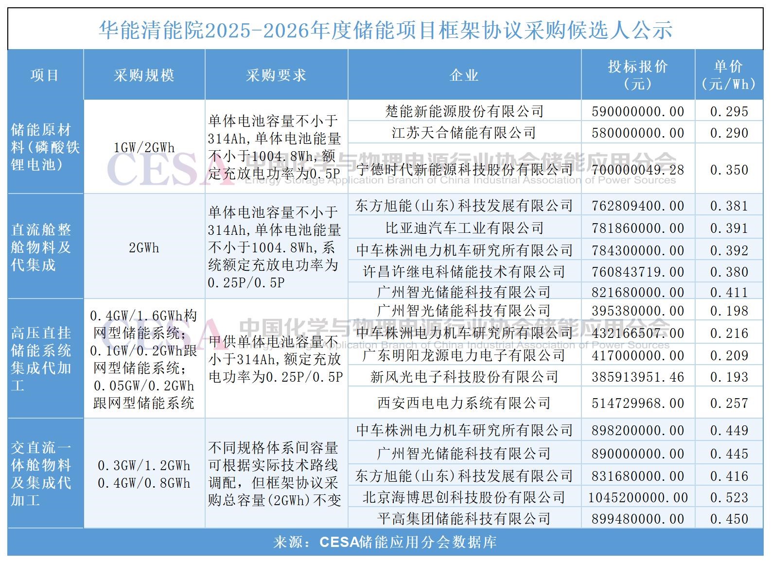 三、0.29-0.35元/Wh!華能2GWh儲(chǔ)能電池框采:楚能、天合、寧德時(shí)代入圍