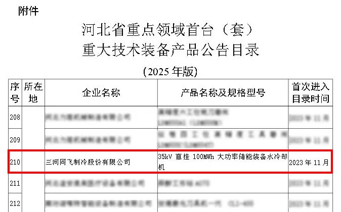 此次入選是同飛股份在儲(chǔ)能溫控技術(shù)領(lǐng)域深厚積累的體現(xiàn)。截至目前,公司共有兩個(gè)產(chǎn)品入選河北省首臺(tái)(套)重大技術(shù)裝備目錄,其中包括2023年11月入選的“35kV直掛100MWh大功率儲(chǔ)能裝備水冷卻機(jī)”,該產(chǎn)品已在多個(gè)大型儲(chǔ)能項(xiàng)目中成功應(yīng)用,獲得客戶高度認(rèn)可。