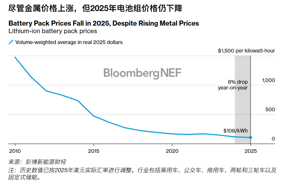 彭博新能源財經(jīng)的年度電池價格調研顯示,2025年鋰離子電池組的容量加權均價為108美元/kWh,同比下降8%。價格下降主要源于電芯產(chǎn)能持續(xù)過剩、市場競爭激烈,以及向低成本磷酸鐵鋰(LFP)電池持續(xù)轉型。今年的價格調研包括來自新能源乘用車、新能源公交車、新能源商用車、兩輪和三輪車以及固定式儲能的320個數(shù)據(jù)點。