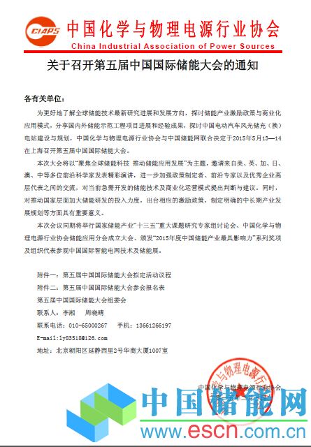 附件三:中國(guó)化學(xué)與物理電源行業(yè)協(xié)會(huì)《關(guān)于召開(kāi)第五屆中國(guó)國(guó)際儲(chǔ)能大會(huì)的通知》文件