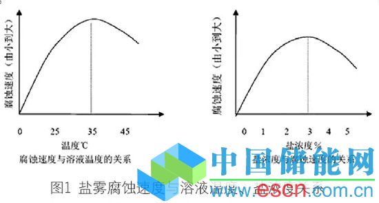 影響鹽霧主要因素包括:溫度、相對濕度、鹽溶液的濃度、鹽溶液的pH值、鹽霧沉降量等,其中溫度和相對濕度、濃度是直接影響鹽霧對金屬的腐蝕因素。金屬腐蝕的臨界相對濕度大約為70%。當(dāng)相對濕度達到或超過這個臨界濕度時,腐蝕速度相應(yīng)加速。南海的年平均相對濕度是85%,自然腐蝕速度加速。鹽霧的腐蝕作用受到溫度及鹽霧濃度的影響,這種影響狀況見圖1。