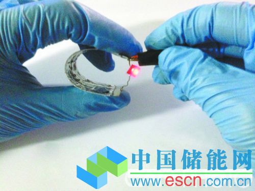 一個(gè)偌大的手機(jī)揣在兜里,鼓鼓的,在夏天總是感覺有些不方便,如果哪天手機(jī)可彎可卷,能像啪啪圈一樣戴在手臂上應(yīng)當(dāng)是件很酷的事情吧。這樣的手機(jī)需要什么樣的電池呢?應(yīng)該是可彎可卷的柔性全固態(tài)薄膜鋰電池?,F(xiàn)在實(shí)驗(yàn)室已經(jīng)研制出了這樣的鋰電池。國(guó)外有報(bào)道稱已經(jīng)在80μm厚的柔性Al箔上沉積Al/Li8V2O5/LiPON/V2O5/Au,制備出了柔性薄膜鋰電池,該電池在10μA/cm2電流密度下循環(huán)次數(shù)超過(guò)5800次,容量衰減小于7%。自2003年起,國(guó)內(nèi)一些高校和科研院所陸續(xù)開展了柔性薄膜鋰電池的研究,但這些研究主要集中在關(guān)鍵材料制備上,缺乏電池整體制備技術(shù),仍處于基礎(chǔ)研究的初級(jí)階段,同時(shí)受資金和技術(shù)制約,柔性全固態(tài)薄膜鋰電池至今沒有產(chǎn)業(yè)化的報(bào)道。中航工業(yè)航材院也組建了相應(yīng)的團(tuán)隊(duì),現(xiàn)已在超薄聚酰亞胺(PI)上實(shí)現(xiàn)了以LiPON為電解質(zhì)的單芯柔性薄膜鋰電池和串并聯(lián)電池模塊也在金屬箔基片上實(shí)現(xiàn)了更適用于商業(yè)化的薄膜鋰電池,實(shí)驗(yàn)數(shù)據(jù)目前在持續(xù)測(cè)試中,圖為中航工業(yè)航材院制備的柔性薄膜鋰電池的原理型樣件。