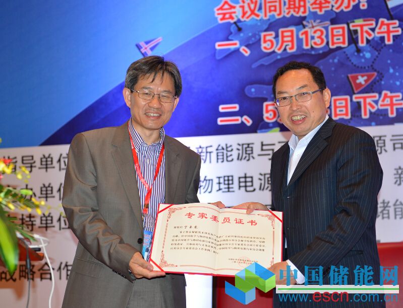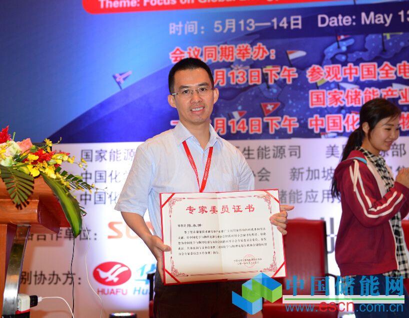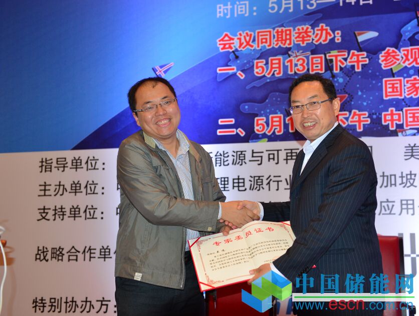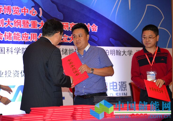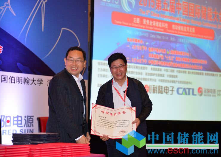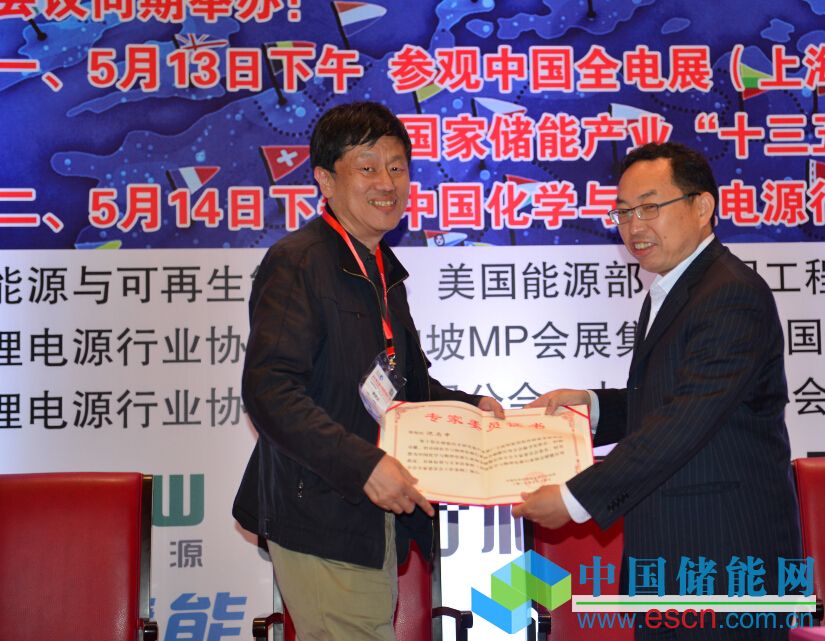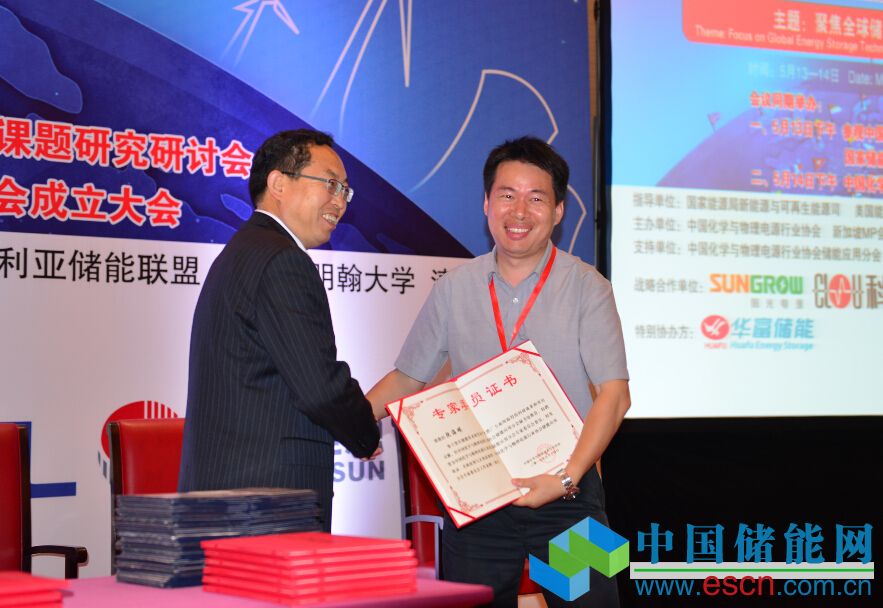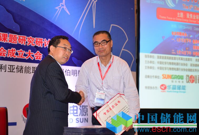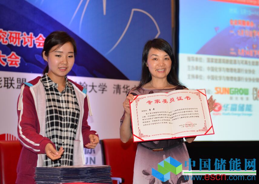 中國化學(xué)與物理電源行業(yè)協(xié)會秘書長為儲能應(yīng)用分會專家委委員頒發(fā)證書。