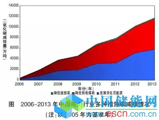 電廠二氧化碳捕集、利用、埋存的試點取得了成功經(jīng)驗。燃煤或燃?xì)怆姀S煙氣中的二氧化碳捕集能力為3000噸/年到12萬噸/年的幾個試點項目在運行;二氧化碳埋存的地質(zhì)調(diào)查也做了大量工作;基于工程項目的燃煤電廠富氧燃燒捕集二氧化碳的國際合作研究有效開展。中國通過發(fā)展非化石能源、降低煤耗和線損率等措施,以2005年為基準(zhǔn)年,2006~2014年,累計減排二氧化碳約60億噸,2014年單位發(fā)電量二氧化碳排放量比2005年降低了19%。根據(jù)作者的相關(guān)研究,電力二氧化碳減排的貢獻(xiàn)見下圖。