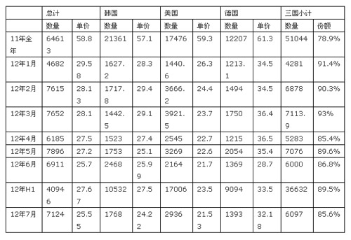 從分國別數(shù)據(jù)來看,7月份,從韓國、美國、德國三國進(jìn)口量占全部進(jìn)口量的85.6%,其中,韓國的市場份額為24.8%;美國的市場份額為41.2%;德國的市場份額為19.6%。同時(shí),韓國、美國的進(jìn)口單價(jià)較6月份都出現(xiàn)不同的下滑,分別為24.22美元/千克和21.53美元/千克;而德國的進(jìn)口單價(jià)小幅回升,為32.18美元/千克。