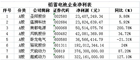 中國儲能網(wǎng)訊:通過對滬深股市、香港股市鉛蓄電池企業(yè)中報進行整理,上海有色網(wǎng)(SMM)發(fā)現(xiàn),鉛蓄電池企業(yè)上半年凈利全線遞增,遠遠好于其他行業(yè),8家上市公司中,除了臥龍電氣凈利同比下滑21.31%外,其余均比去年同期有所增長。