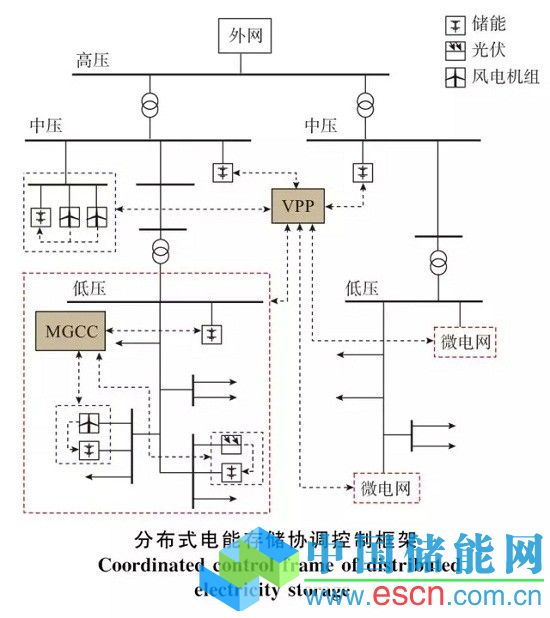 3)廣域協(xié)調(diào)控制。對(duì)于在地理位置上分布較廣的分布式電能存儲(chǔ)系統(tǒng),無(wú)法直接采用微電網(wǎng)模式進(jìn)行管理和控制,需通過(guò)配網(wǎng)調(diào)度或者虛擬電廠(VPP)技術(shù)。此時(shí)的協(xié)調(diào)控制需涵蓋多個(gè)微電網(wǎng)以及微電網(wǎng)覆蓋范圍以外的分布式電能存儲(chǔ)系統(tǒng),進(jìn)而實(shí)現(xiàn)廣域協(xié)調(diào)控制。