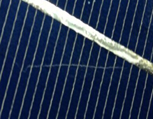 EVA膠膜是電的絕緣體,其和任何絕緣體摩擦后會(huì)產(chǎn)生靜電。靜電的電壓可以達(dá)到很高,在積累到一定的程度后,其會(huì)以電弧形式直接釋放電荷。靜電的釋放會(huì)在EVA膠膜中瞬間產(chǎn)生短路而導(dǎo)致了瞬間的高溫,而高溫正是EVA膠膜交聯(lián)的誘因。因其在很微小的范圍內(nèi)可能達(dá)到很高的溫度而導(dǎo)致EVA膠膜中的過(guò)氧化物劇烈反應(yīng)留下痕跡,或者是EVA樹(shù)脂被電荷擊穿導(dǎo)致類(lèi)似電纜絕緣層被擊穿后留下的樹(shù)枝狀痕跡。其既可能是在非常微小范圍內(nèi)發(fā)生的劇烈交聯(lián),其也可能是過(guò)氧化物直接分解,其也可能是EVA樹(shù)脂被擊穿后留下了擊穿的痕跡??傊摵圹E在組件層壓EVA樹(shù)脂經(jīng)過(guò)融化而變成全透明后,在藍(lán)色或者黑色的電池片上非常明顯的顯現(xiàn)出來(lái)。這種白色線條明顯的特征是形狀類(lèi)似于閃電、有分叉,大小不一。