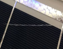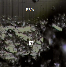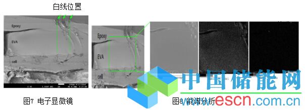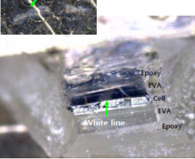 在模擬組件白線發(fā)生前,海優(yōu)威首先對(duì)白線發(fā)生的部位進(jìn)行成分分析。首先對(duì)白線的位置取樣。過(guò)程是先破壞組件,將電池片和EVA膠膜從玻璃上剝離。對(duì)有白線的部位進(jìn)行取樣并封閉在環(huán)氧樹(shù)脂中,在-135℃下切片,用光學(xué)顯微鏡、電子顯微鏡、能譜分析、紅外光譜等分析手段檢查是否在白線中含有雜質(zhì)或者其它非EVA材料。