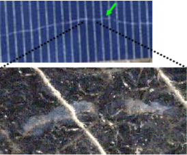 光伏組件在生產(chǎn)過(guò)程中,偶爾會(huì)在電池片的表面出現(xiàn)白色線條,導(dǎo)致整個(gè)組件降級(jí)。有些白色線條,如光伏電池片、玻璃在層壓前的機(jī)械性損傷,會(huì)造成諸如電池片劃傷(圖1)、玻璃劃傷(圖2)和玻璃磨損(圖3)等白色線條。這類(lèi)線條通過(guò)肉眼容易辨別,并且在組件層壓前就可以被發(fā)現(xiàn),因此生產(chǎn)過(guò)程中防范也比較容易。而另一種白色線條并非機(jī)械損傷造成,外觀形式閃電,往往在末端還會(huì)開(kāi)叉、分支(圖4)。其在層壓前沒(méi)有任何的朕兆,只有在層壓后才會(huì)被發(fā)現(xiàn)。而且往往換了一批EVA膠膜后,該現(xiàn)象就不再出現(xiàn),所以組件廠一般會(huì)把這個(gè)問(wèn)題歸咎于EVA膠膜工廠的生產(chǎn)質(zhì)量問(wèn)題。而EVA膠膜廠因?yàn)榕浞健⑸a(chǎn)工藝沒(méi)有任何更改,所以也無(wú)從防范該現(xiàn)象的再次發(fā)生。當(dāng)出現(xiàn)組件發(fā)生類(lèi)似質(zhì)量問(wèn)題時(shí),組件廠往往要求EVA膠膜廠收購(gòu)出現(xiàn)白線的組件來(lái)解決,但實(shí)際的原因雙方并沒(méi)有查清。