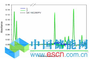從紅外圖譜(圖9、圖10)看,白線部分的取樣只有EVA樹(shù)脂(NE280PV)和硅(光伏電池片成分)的吸收譜,可以說(shuō)明在取樣的白線位置沒(méi)有其它的有機(jī)雜質(zhì)。