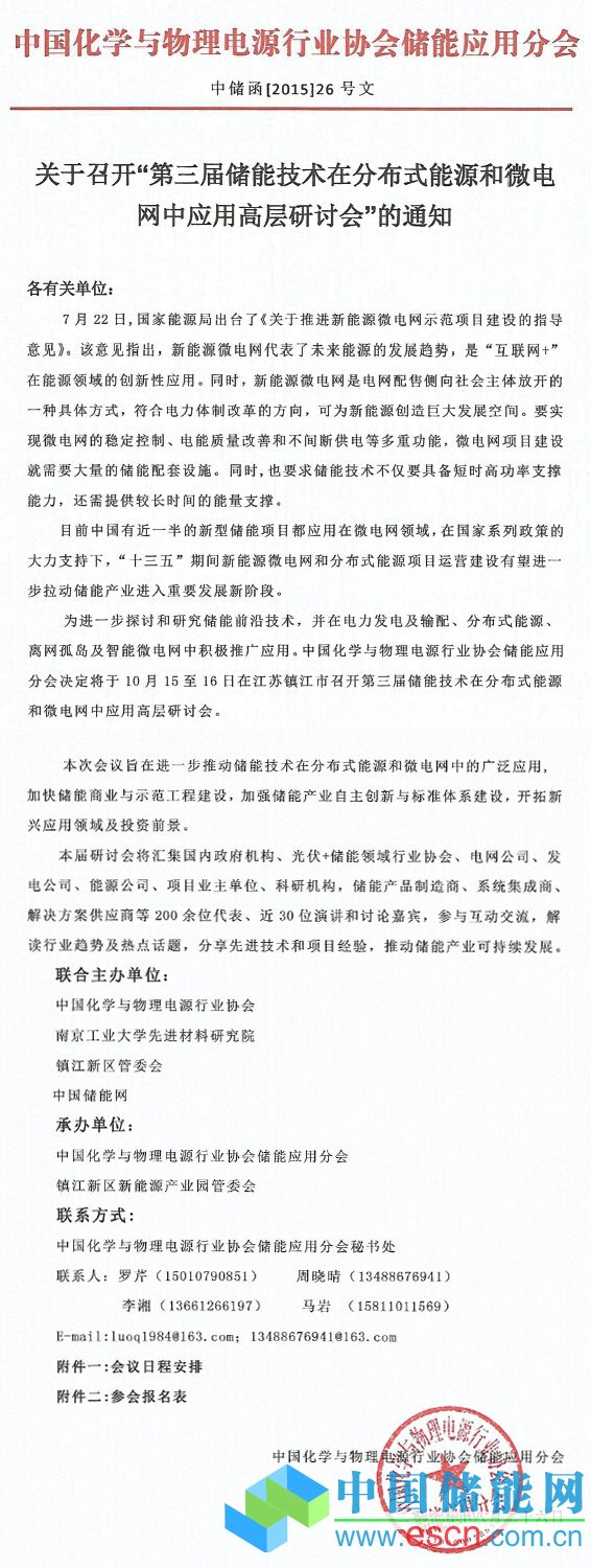 關于召開“第三屆儲能技術在分布式能源和微電網(wǎng)中應用高層研討會”的通知