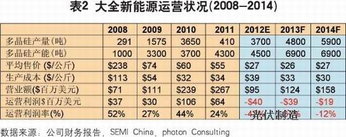 需求不振,從模組到多晶硅的價格也就失去了回穩(wěn)和反彈的基礎(chǔ)。以多晶硅價格為例,目前維持在27~28美元/公斤的長約價格和22~23美元/公斤的現(xiàn)貨市場價格在今年下半年要反彈到大約35美元/公斤以上的可能性微乎其微。因此,對于眾多生產(chǎn)成本在30-35美元/公斤的中國廠商來說,關(guān)閉工廠成了必然的選擇。當(dāng)然,市場需求(包括價格)和生產(chǎn)成本并不是決定企業(yè)生死存亡的唯一因素。中國一些有大型國營和民營集團背景的多晶硅廠商有可能通過母公司或者銀行的財政支持,在虧本的情況下繼續(xù)維持一段時間,關(guān)鍵是虧本經(jīng)營的時間可以維持多久?表2顯示了大全新能源自2008年以來的運營狀況以及一些機構(gòu)的預(yù)測。這一預(yù)測顯示,大全新能源在未來2~3年里有可能一直處于虧損狀態(tài),除非市場出現(xiàn)戲劇性好轉(zhuǎn)。公司的市場和經(jīng)營戰(zhàn)略轉(zhuǎn)型看來不可避免。