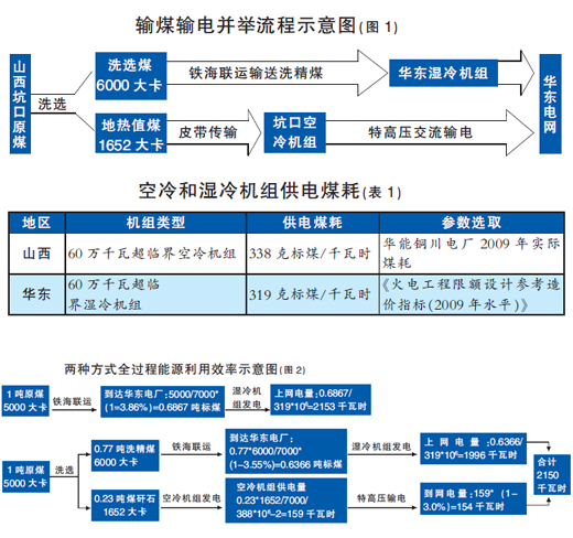 晉陜蒙寧新是我國(guó)主要的煤炭送端地區(qū)。研究表明,即使考慮到送端空冷機(jī)組煤耗相對(duì)較高,鐵海聯(lián)運(yùn)輸煤和輸煤輸電并舉的全程能源利用效率仍基本相當(dāng)。以山西——華東沿海為例分析如下。