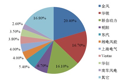 報(bào)告顯示,到2011年底,中國(guó)(除臺(tái)灣省未統(tǒng)計(jì)外)有31個(gè)省(直轄市)、自治區(qū)和特別行政區(qū)參加了風(fēng)電場(chǎng)建設(shè),累計(jì)安裝并網(wǎng)型風(fēng)電機(jī)組45894臺(tái),裝機(jī)容量約6236.4萬(wàn)kW。與2010年累計(jì)裝機(jī)4473.3萬(wàn)kW相比,2011年累計(jì)裝機(jī)增長(zhǎng)率為39.4%。2011年,新增風(fēng)電裝機(jī)中,排名前五位的分別為金風(fēng)、華銳、聯(lián)合動(dòng)力、明陽(yáng)和東方汽輪機(jī),裝機(jī)容量分別為3600MW、2939MW、2847MW、1177.5MW和946MW。年生產(chǎn)、新增裝機(jī)超過(guò)500MW的企業(yè)達(dá)到9家,市場(chǎng)排名前15的企業(yè)新增裝機(jī)均超過(guò)了300MW,比2010年增加3家,而“十一五”之初僅有一家企業(yè)年裝機(jī)超過(guò)300MW。(下圖所示)