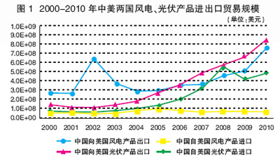 進(jìn)入21世紀(jì),中美兩國在新能源產(chǎn)品開發(fā)領(lǐng)域都取得了巨大成果,由于各自發(fā)展優(yōu)勢(shì)不同,兩國之間的新能源貿(mào)易規(guī)模近年增速明顯。統(tǒng)計(jì)數(shù)據(jù)顯示,2010年美國從中國進(jìn)口新能源產(chǎn)品總額達(dá)到36.01億美元,出口總額為32.22億美元,年均增速分別達(dá)到了29.16%和22.86%,其中風(fēng)電產(chǎn)業(yè)和光伏產(chǎn)業(yè)產(chǎn)品規(guī)模比重占到了近40%。風(fēng)電產(chǎn)業(yè)方面,目前我國已成為亞洲第一、全球第二的風(fēng)電大國,2010年中美之間的風(fēng)電產(chǎn)品設(shè)備貿(mào)易規(guī)模達(dá)5.64億美元,年均增速更是達(dá)到了26.95%,但從進(jìn)出口差額來看,我國一直處于順差地位且貿(mào)易差額逐年擴(kuò)大,表明我國的風(fēng)電產(chǎn)業(yè)發(fā)展較為強(qiáng)勢(shì)(圖1);光伏產(chǎn)業(yè)方面,近年中美光伏產(chǎn)品貿(mào)易規(guī)模也保持了近28%的年均增速,2010年已達(dá)25.27億美元,其中中國對(duì)美國出口增速比進(jìn)口高出10多個(gè)百分點(diǎn)的測(cè)算結(jié)果證明了中國光伏電池企業(yè)向美國出口增加的事實(shí)(圖1)。總結(jié)來看,同樣作為世界數(shù)一數(shù)二的能源消費(fèi)大國,中國新能源產(chǎn)業(yè)至少在初期表現(xiàn)出了比美國更快的發(fā)展速度,尤其是在風(fēng)電及光伏產(chǎn)業(yè)方面,而這也正是令美國新能源企業(yè)感到競(jìng)爭危機(jī)進(jìn)而發(fā)起貿(mào)易保護(hù)的主要原因之一。