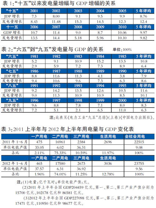 社會(huì)方方面面之所以有這種質(zhì)疑,緣于沒有全面了解我國(guó)改革開放以來用電量與GDP的關(guān)系。這些讀者都認(rèn)為,我國(guó)用電量增幅高于GDP增幅理所當(dāng)然,一旦某一年份用電量增幅低于GDP增幅就認(rèn)為不正常。這是為什么呢?這是因?yàn)樽?000年到2011年的11間,其中9個(gè)年頭我國(guó)用電量增幅是高于GDP增幅的,而且11年內(nèi)用電量年平均增幅也是高于GDP的(見表1)。殊不知,我國(guó)自改革開放以來,有很多年份用電量增幅是低于GDP增幅的。如1978年至2000年21年間,我國(guó)用電量大部分年份增幅是低于GDP的,而且年均用電量增幅也是低于GDP增幅的。比如“六五”時(shí)期GDP平均增幅為10.8%,而用電量平均增幅為6.4%;“七五”時(shí)期GDP增幅為8.6%,用電量增幅為9.1%;“八五”時(shí)期增幅為11.6%,用電量增幅為10.1%;“九五”時(shí)期GDP增幅為8.3%,用電量增幅為6.3%。從“六五”到“九五”的20年時(shí)間內(nèi),只有“七五”的用電量增幅高于同期的GDP增幅,其余15年都是用電量增幅低與GDP增幅的,而且這20年用電量平均增幅也是低于GDP增幅的(見表2)。