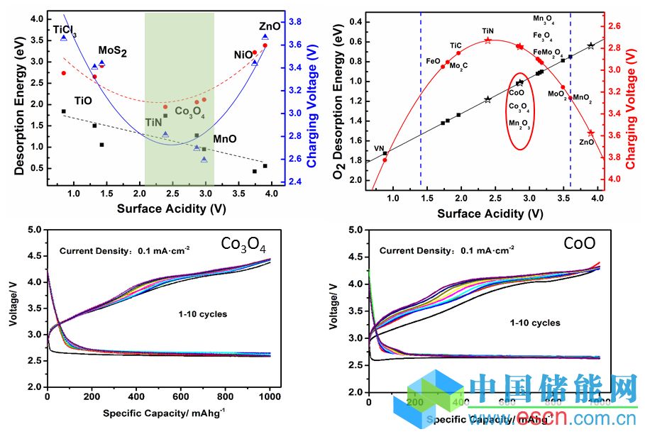 圖1.鋰空氣電池過(guò)電位-催化劑表面酸性的關(guān)系與催化劑預(yù)測(cè)(上),及Co3O4與CoO體系的實(shí)驗(yàn)驗(yàn)證結(jié)果(下)。