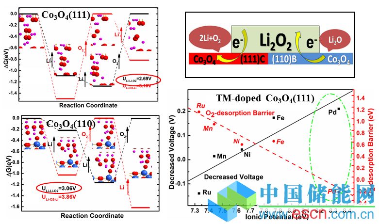圖3.第一性原理熱力學(xué)計(jì)算Co3O4(111)與(110)表面催化Li2O2分解機(jī)理,晶面效應(yīng)的電荷分析,及過(guò)渡金屬摻雜Co3O4(111)的催化性能優(yōu)化。