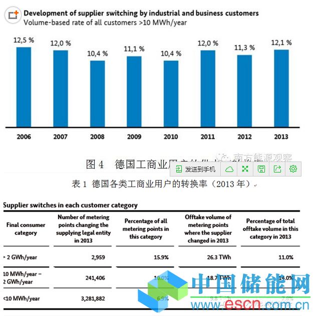 德國1998 年開始對所有用戶開放售電市場。到2013年,用戶的可選擇的已經(jīng)非常豐富了,終端用戶在每個網(wǎng)絡(luò)區(qū)域平均可以選擇97個供應(yīng)商(不考慮關(guān)聯(lián)公司),家庭用戶可選的供應(yīng)商數(shù)量平均為80個。用戶信息的獲取、合同的轉(zhuǎn)換也非常便利,一個電話或在線按個ENTER就可以解決。在零售商競爭如此激烈,用戶選擇如此眾多、便利的市場上,2013年德國居民用戶轉(zhuǎn)換率僅為7.8%,居民用戶電量轉(zhuǎn)換率為8.6%。2006-2013年間,德國商業(yè)和工業(yè)用戶轉(zhuǎn)換率平均每年僅12%左右,包括同一零售商下的不同合同轉(zhuǎn)換和不同零售商之間的來回轉(zhuǎn)換(見圖4),其中年電量大于2GWh的用戶轉(zhuǎn)換率居中,為11%,年電量在10MWh至2GWh的用戶轉(zhuǎn)換率最高,為14.0%,而年電量較小的客戶轉(zhuǎn)換率最低,為7.8%。電量大的用戶對價格更加敏感,在售電市場中更加活躍,而電量非常大的用戶,作為零售商的主要創(chuàng)收來源,零售商們可能提供了更優(yōu)惠的價格或更專一的服務(wù),以增強(qiáng)客戶粘性。在一來一往的相互選擇下,造就了售電市場的競爭格局。英國也是最早放開售電市場的國家之一,但2014年電力用戶的轉(zhuǎn)換率也僅為11.1%。