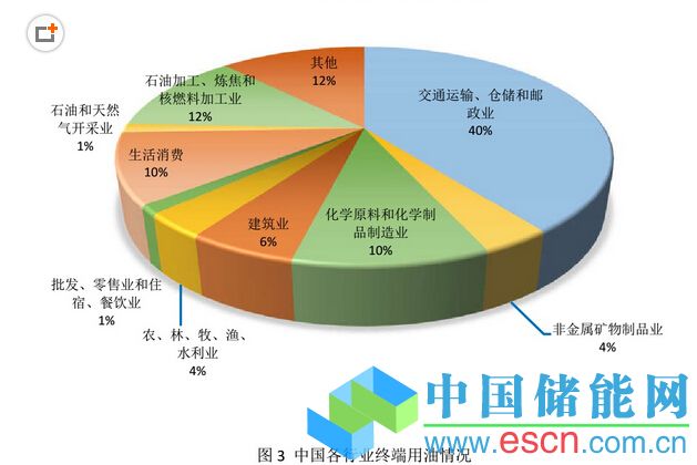 國家統(tǒng)計局數據顯示,2014年中國能源消費量約42億噸標準煤,按終端消費量看,電能占比僅23%(圖1)。除電力以外,煤和石油兩種化石能源各占剩余總量的約32%。其中,非金屬礦物制品業(yè)、黑色金屬冶煉和壓延加工業(yè)、生活消費三大領域,分別消耗了終端用煤的26%,14%,11%(圖2)。石油則主要消耗在交通運輸、倉儲和郵政業(yè),占到了終端用油的40%(圖3)。