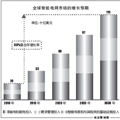 孤獨(dú)的特高壓智能電網(wǎng)將怎樣和其他國(guó)家的同行互通有無(wú)呢?凱捷公司已經(jīng)感受到了在中國(guó)推廣智能電網(wǎng)過(guò)程中因技術(shù)設(shè)備不統(tǒng)一產(chǎn)生的困境,并建議中國(guó)更多地參與到國(guó)際智能電網(wǎng)標(biāo)準(zhǔn)的制定中,杰克斯·米勒里稱(chēng):“參與到標(biāo)準(zhǔn)的制定中,中國(guó)可以更好地同其他國(guó)家在同一個(gè)水平上開(kāi)發(fā)和生產(chǎn),生產(chǎn)的產(chǎn)品也能快速應(yīng)用到國(guó)際市場(chǎng)上。”很明顯,沒(méi)有一個(gè)與國(guó)際銜接的技術(shù)環(huán)境,即使是再“堅(jiān)強(qiáng)”的電網(wǎng),也會(huì)因?yàn)槿狈涣鞫兊煤艽嗳酢T谏锨|美元的全球智能電網(wǎng)市場(chǎng)預(yù)期中(見(jiàn)圖表),中國(guó)能分到幾許呢?