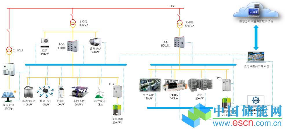 圖2所示該微電網(wǎng)系統(tǒng)結(jié)構(gòu)示意圖,兩個相對獨立分布式儲能系統(tǒng),其中位于集團辦公樓的子系統(tǒng)針對空調(diào)、電梯、照明、蓄熱鍋爐、數(shù)據(jù)中心及一些辦公設(shè)備,蓄熱鍋爐錯開用電高峰,在冬季的零點至早上五點之間工作。而位于生產(chǎn)樓的子系統(tǒng)主要針對生產(chǎn)裝配、PCBA和老化車間的生產(chǎn)類負載。下面簡單介紹該微電網(wǎng)建設(shè)的必要性和運行特點。